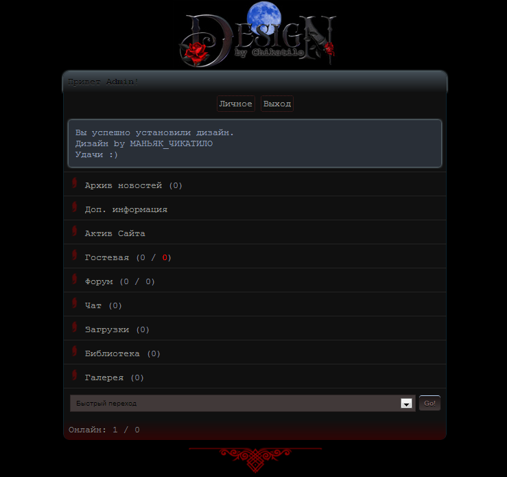 Дизайн готический, в тёмных тонах для JohnCMS 3.2.2, делал для своего портфолио, но потом решил кинуть в пабл)