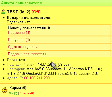 KanzaS (27.01.2011/15:29)Дело в том, что я еще обновление сделаю, чтоб администратор мог пользователю в редакторе анкеты вписать монеты! И мне как то лучше было чтоб монеты были! Кто хочет может изменить в коде на баллы