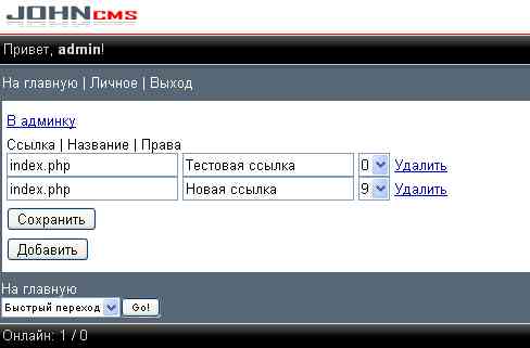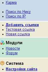 valerik88, Не все ссылки запускаются напрямую.многие требуют что бы в индексе админ панели в строке $array = array('usr_reg', 'usr_adm', 'usr_list', 'usr_del', 'usr_ban', 'usr_search_nick', 'usr_search_ip', 'mod_ads', 'mod_counters', 'mod_news', 'mod_forum', 'mod_chat', 'sys_set', 'sys_smileys', 'sys_access', 'sys_antispy', 'sys_ipban', 'mod_karma', 'sys_flood','mod_blogs','mmenu','stol','mod_nav','mod_rules'); было название страницы плюс сама ссылка вида индекс.пых?акт=блабла