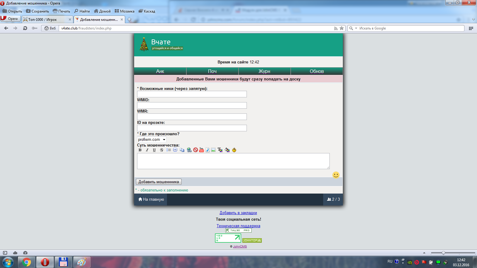 Добавление мошенника (юзер/админ), запись от админа сразу проходит модерацию, запись от пользователя встает на модерацию (страницы модерации пока нет).