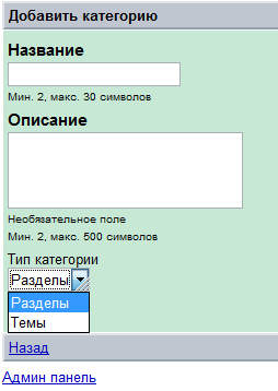 Данный хак дает возможность при создании категории (подфорума), указывать ее тип, т.е. категория может быть предназначена как для разделов, так и сразу для тем (т.е. без разделов).