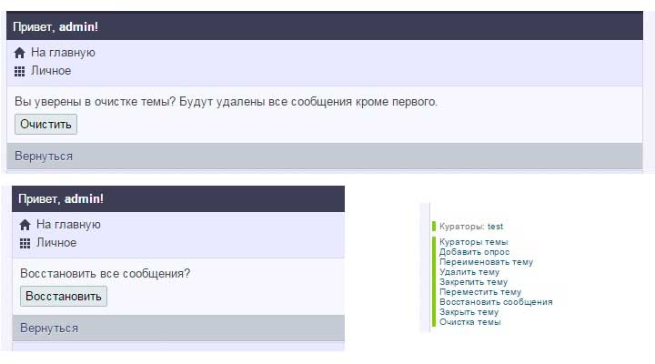 Почистить тему могут ее кураторы, модеры форума, старший мод и админ с СВ (если чистит админ, то все сообщения удаляются из базу, иначе все посты просто скрываются). Возможность восстановить все сообщения имеет только СВ. Ну и еще небольшим бонусом ко всему этому добавил возможность закрытия/открытия темы ее куратором.