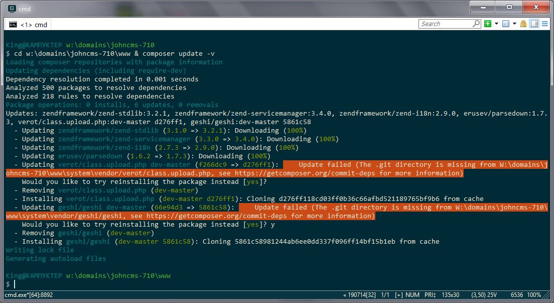 • Запустил команду cd w:\domains\johncms-710\www & composer update -v