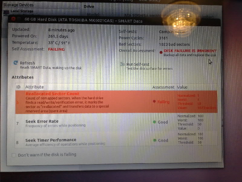 Попросили поставить винду, ставил ставил, но в один момент все с новой начиналось. Взял ноутбук домой. Запустил лайв сиди убунты (все что осталось после продажи компа), убунта сразу написала о проблемах с жестким. Смарт посмотрел и офигел. Говорилось о том что жд новый, а он отработал 261день уже. Плюс 5пункт смарта пишет про ошибки, но я не помню что есть что