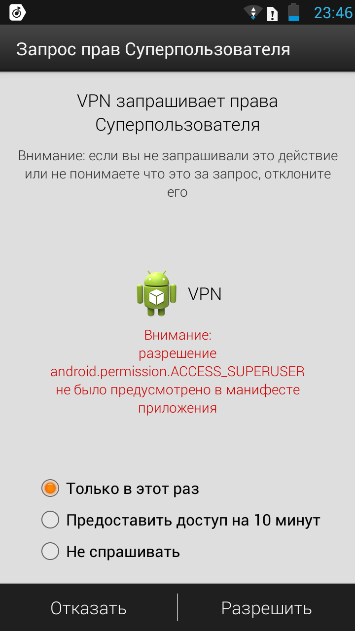 Решил сбросить настройки, но ничего не помогло. Минут через 10 после сброса вылезло такое сообщение: "VPN запрашивает права суперпользователя", что бы я не жал, но сразу после этого сообщения начинает моя проблема.
