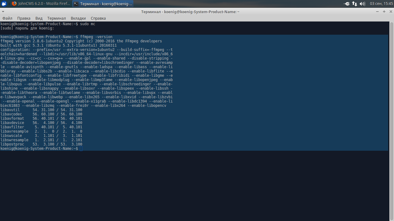 ->save(new FFMpeg\Format\Video\WebM(), '/srv/www/localhost/export-webm.webm'); Koenig, поправил бы твой гайд по установке php. Рискованно ставить 7.0 и потом танцевать с бубном над понижением версии, так тот же джон не заведется. Можно поставить PPA, который дает возможность использовать несколько версий пыха и по надобности включать необходимую версию.