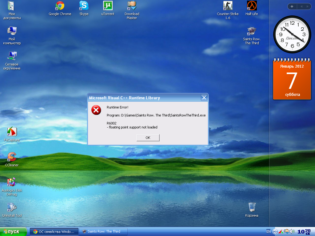 В общем установил игру Saints Row:The Third, первый раз открылась все нормально работало.Пришел вечером хотел поиграть опять, а мне вот такая ошибка.И к стати у меня другие игры из-за этого глючат!В чем может быть проблема и как ее исправить?