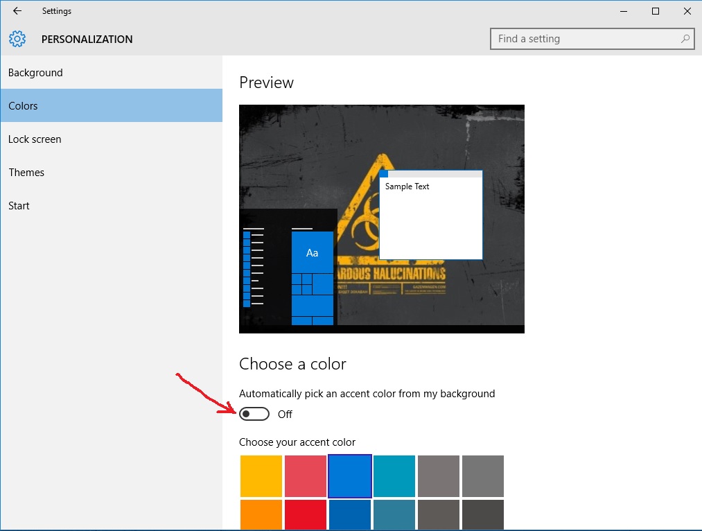 3) Выключаем тумблер "Automatically pick an accent color from my background"