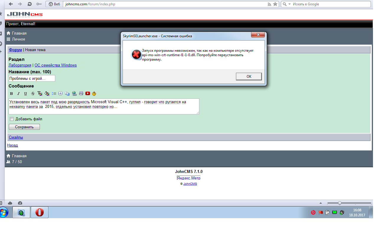 # Eternal (18.10.2017 / 18:19)Не обязательно ставить 2 пакета x86 и x64 разрядность. В системе посмотри какой разрядности, если x64 то только его и устанавливать. Разрядность x86 не подойдет к системе, и будет вываливать ошибку об библиотеки этой. Кстати, произойдет конфликт с библиотеками.