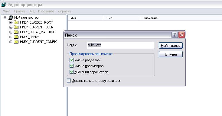 ctrl+f поиск subst.exe вводишь, ищишь и справа все что найдешь выделяй и удаляй, продолжай поиск пока не скажет что не нашло ни чего