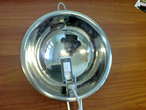 Проделать дырку сбоку и вставить в неё модем. Потом, с помощью юсб-удленителя, поставить модем с дуршлагом куда-нибудь ближе к окну.
