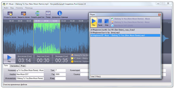 Новый, приятный, современный интерфейс. Теперь главным окном программы является окно редактора рингтона. А все настройки доступны на панели с закладками внизу окна