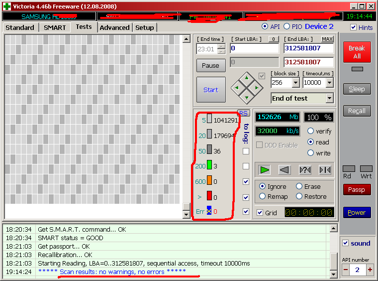 Собственно тест. он показал весьма неплохие результаты на весь 160гб диск только 3 сектора считались чуть дольше остальных.