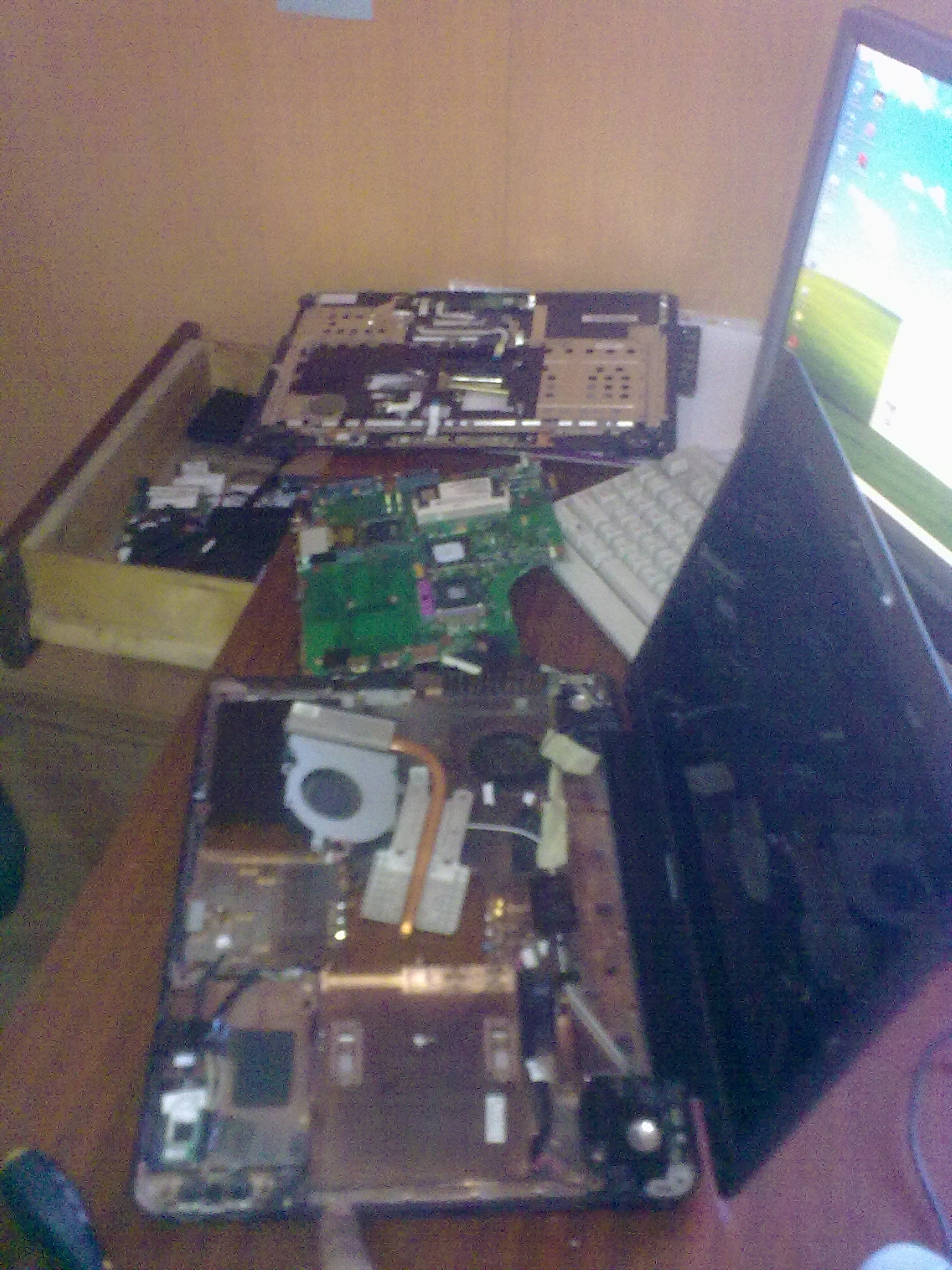 После того, как я потратил 1,5 часа на снятие жесткого диска (потом вернул, разборке не мешал), дисковода, крышки от оперативки (сама оперативка тоже не мешала), выкручивания кучи шурупов и отщелкивания всевозможных фиксаторов, я обнаружил, что единственное чего я смог добиться, это приподнятия крышки с клавиатурой. Дальнейшему её снятию мешали провода и шлейфы идущие от неё к материнке.