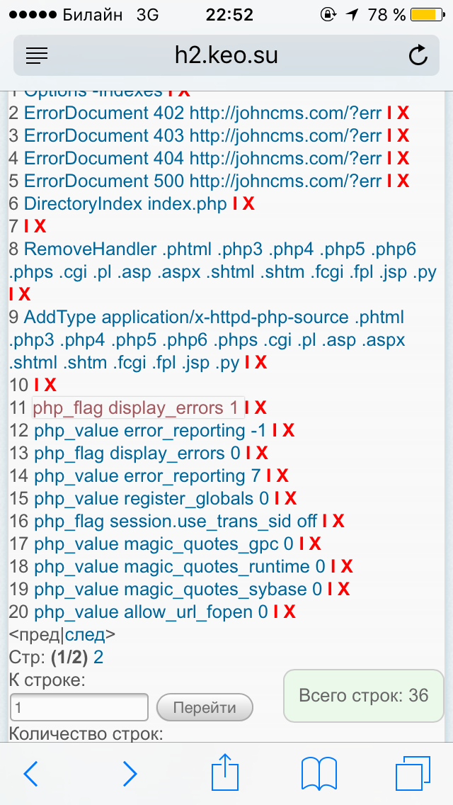 Husen, у тебя строки дублируются в .htaccess смотри скрин, ты добавил строки новые а ниже опять их обратно выключил