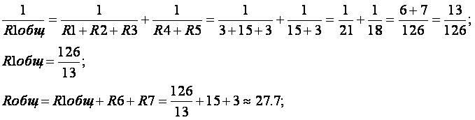 3. Найти общее сопротивление цепи и силу тока в нем, если сопротивление первого, третьего, пятого и седьмого резисторов 3 Ом, а второго, четвертого и шестого 15 Ом.