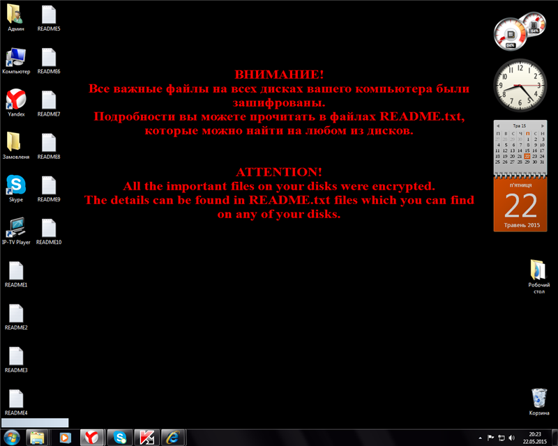 Вобщем проблема в том, что на главной страничке винды надпись красными буквами, мол все файлы зашифрованны и читайте редми на любом диске - их там вагонами..