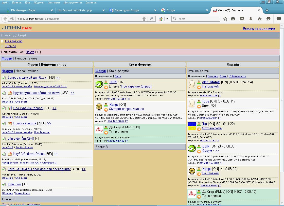 Добавил в заголовок браузера title уведомления со счётчиком о новых темах на форуме, и о новых письмах в приват. Это позволяет видеть свежие события на джоне, находясь в другой вкладке браузера (см.скрин)