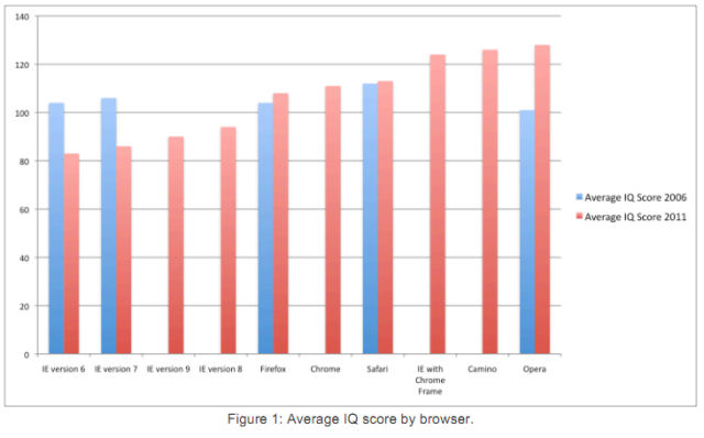 Следом с IQ около 110 следовали пользователи Safari, Chrome и Firefox. В то же время средний интеллектуальный коэффициент поклонников Internet Explorer не дотягивает до 100, причем у пользователей IE 7 и IE 6 он ниже 90.