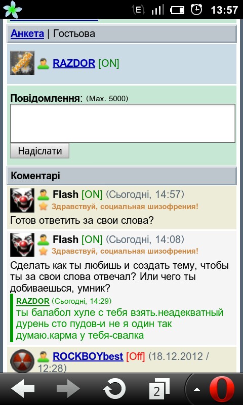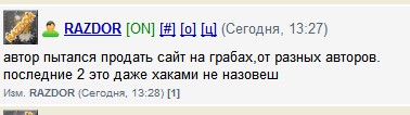Начнем с его темы с клеветой на Alex-F. Мало того, что та тема являлась клеветой, так еще и был обнаружен факт его попытки в барыжничестве. Еще в начале темы я оставил ему отзыв, что барыга. Но потом в ходе разбирательств барыжничество устранили и карму ему зачистили. После этого я оставил новый отзыв, что не барыга, а был замечен в попытке барыжничества. И считаю отзыв вполне обоснованым, так как факт попытки барыжить был. После этого виновник темы начал "срать" мне в кармо своей клеветой, утверждая, что я балабол. Меня конечно не беспокоят отзывы подобных личностей и за удалением "высраных" отзывов я обращаюсь редко, но данный индивидум попадает под исключение. Но Олег не стал вникать и удалил и мои отзывы. После чего я вернул свой отзыв и этот начал опять "срать" в карму и личку. На вопрос чего он добиваеться в ответ опять последовала клевета (скрин. мат).