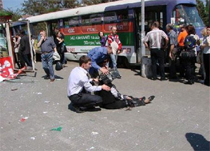 В результате первого взрыва, который произошел в мусорном баке рядом с остановкой "Оперный театр" в центре города, пострадали пять человек. Как передал корреспондент агентства "Интерфакс", взрыв произошел в момент, когда к остановке подъехал трамвай с большим количеством людей. На месте работают оперативные службы МЧС и МВД. В милиции корреспонденту агентства "Интерфакс" подтвердили, что причиной взрыва было взрывное устройство.