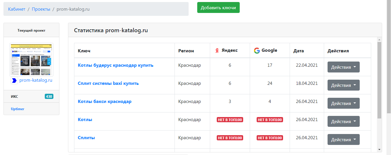 В ЛК на данный момент можно создавать проекты (сайты), отслеживать позиции по ключам с историей изменений, так-же по ключам релевантные страницы собираются из google и яндекс соответственно.