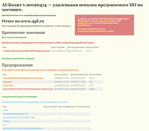AI-Bolit — это уникальный бесплатный скрипт для поиска вирусов, троянов, backdoor, хакерских активностей на хостинге.