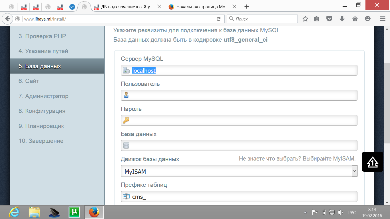 На начальном этапе инсталяции движка - не могу пройти за незнанием мускул сервера.