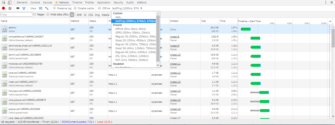 Для теста в хроме был создан специальный профиль с высокой скоростью загрузки, но с пингом в 1 секунду.