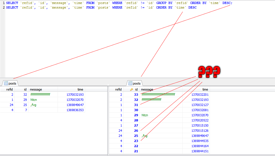 Screamer, зачем вообще там груп, поставь в ордер бай пару условий, order by time desk and id asc