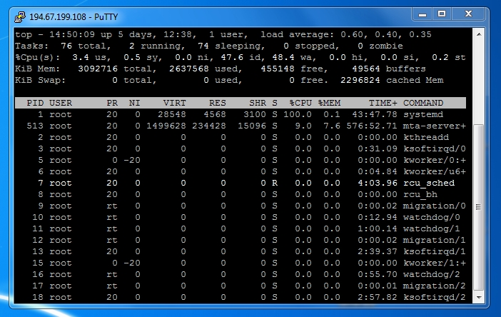 Kip-OK, где ты там увидел 100% нагрузки? На первом скриншоте общая нагрузка сервера 3.4% а на втором 1.8%.