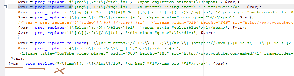 $var = preg_replace('#\[img\](.+?)\[/img\]#si', '<a href="\1"><img src="\1" alt="IMG"/></a>', $var);