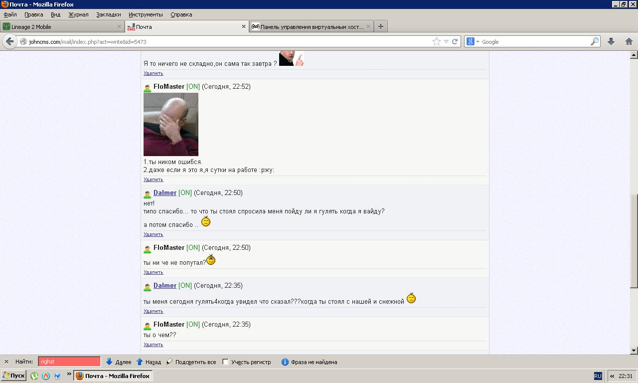 без стой а меня нет тебя!УдалитьМ FloMaster [ON] (Сегодня, 22:54)слушай отстань ты меня с кем то путаеш малостьУдалитьМ Dalmer [ON] (Сегодня, 22:53)Я то ничего не складно,он сама так завтра ? УдалитьМ FloMaster [ON] (Сегодня, 22:52)