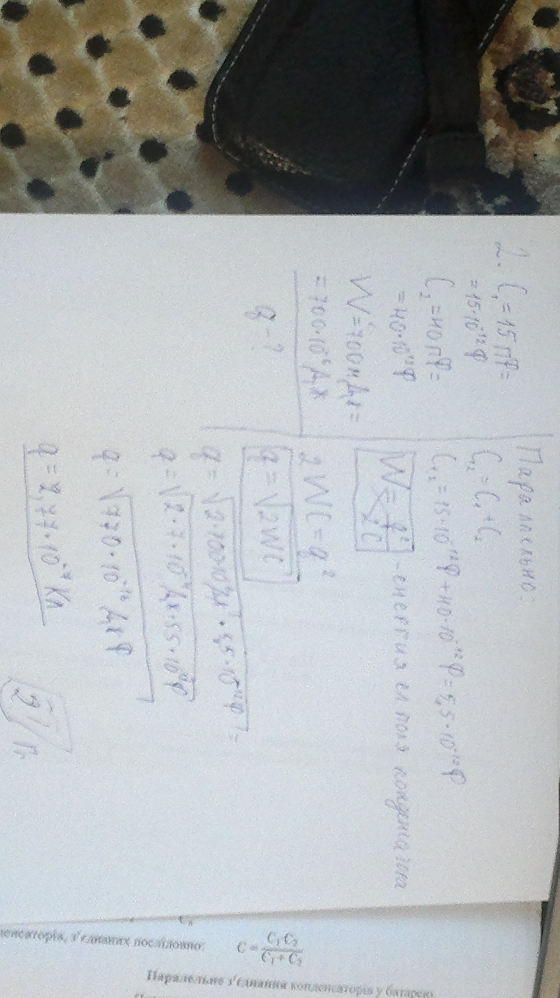 2. Два конденсатора емкостью 15 и 40 пФ соединены параллельно. Найти заряд на обложках, если энергия заряженного конденсатора 700 мДж.