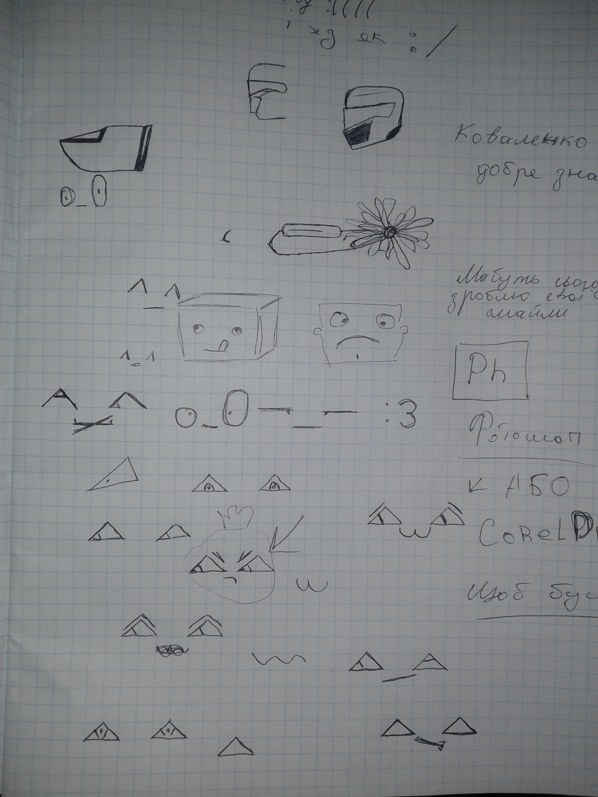 Сегодня сидели группой на лекции по ПиаРу, и что то так скучно стало. начал рисовать в тетрадке всякую нечисть, и что-то так вышло что нарисовал пару треугольников и вышел как бы смайлик. Решил всё это дело перенести в "цифровой формат". Вот что сегодня нарисовал (сейчас выгружу фото.