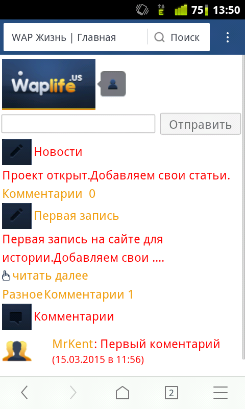Всем привет.Хочу рассказать вам о проекте Waplife.Us.Данный проект предназначен для различных блогов пользователей про Wap.Сервис включает в себя 8 разделов в который любой зарегистрированный пользователь может добавить статью.После модерации она публикуется в самом блоке.Также присутствует мини чат чтоб любой пользователь мог просто пообщаться друг с другом.Спасибо за внимание.